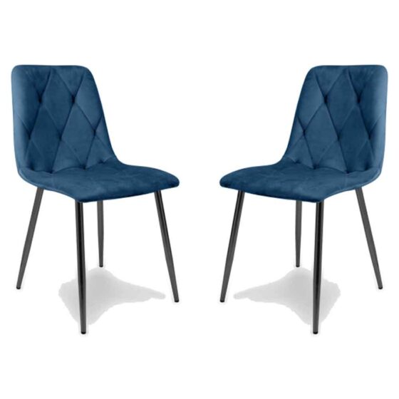 Elevate your dining space with the Furniture in Fashion Vestal Velvet Dining Chairs in Blue, impeccably designed to blend luxury, comfort, and contemporary style. Upholstered in rich blue brushed velvet, these dining chairs bring a bold yet elegant aesthetic to modern interiors. The deep colour and sleek silhouette make them an eye-catching addition to any dining room, living space, or open-plan home where design and comfort go hand in hand. Crafted to enhance both everyday meals and special occasions, each chair features a contoured seat and back with striking diamond pleated stitching for added texture and sophistication. Supported by sturdy black metal cross-frame legs, these chairs offer long-lasting durability and a stylish foundation that suits a variety of dcor schemes. Assembly is simple and straightforward, making it easy to enjoy your new seating right away. FEATURES : Material : Velvet, Metal Finish : Blue, Black Adds a luxurious pop of colour and soft tactile feel to your dining area Gently sloped seat and back provide supportive, cosy seating for extended meals and conversations Stylish detailing that elevates the visual appeal and modern character Sleek, contemporary leg design enhances stability and durability Works beautifully with contemporary, minimalist, and eclectic interiors Great for family dinners, dinner parties, or everyday seating needs Velvet fabric is simple to keep clean, just wipe with a soft, damp cloth Available at an affordable price Images shown are for illustration purpose only DIMENSIONS : Height : 84cm Width : 43cm Depth : 56cm